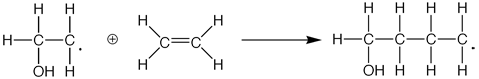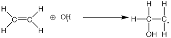 The free radical, or the attacking group in the reaction, (e.g. the Hydroxyl group) forces the ethene group to break its double bond, thus resulting in a group with an extra electron. Thus, this compound is then able to attack another ethene group, in the reaction shown below.
