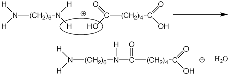 In this reaction, the hydrogen from the first compound, and the hydroxyl group of the second react, forming a water molecule, and forcing a C-N bond upon the larger molecule. This larger molecule, called a dimer (two monomers joined together, can further react because it has a reactive hydrogen and hydorxyl group still in place. Thus, we will write this reaction in a common notation for polymers, which you are almost sure to see sometime in your chemical career:
